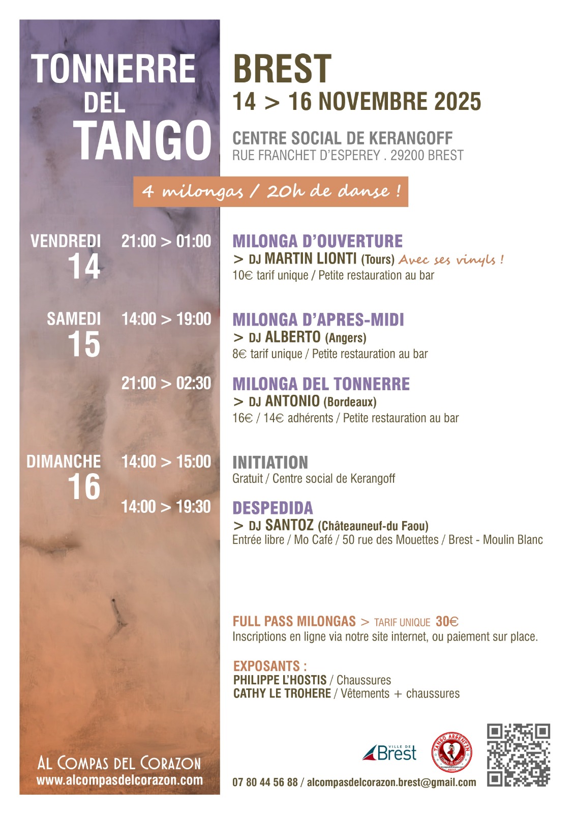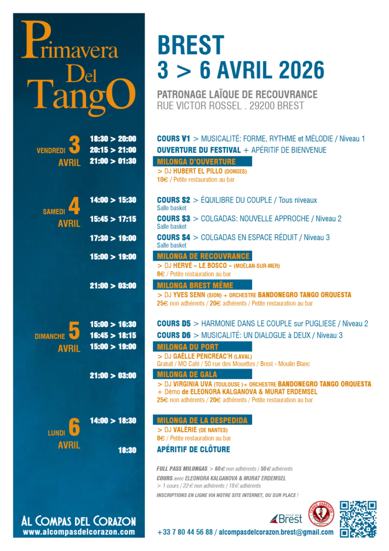 Jeune danseur breton parti étudier le tango argentin à Buenos Aires, Raphael Le Vanic revient à Brest avec sa partenaire Solène Pichau pour une série de 4 cours. Ces cours sont gratuits pour les adhérents, et accessibles sur inscriptions pour les extérieurs.